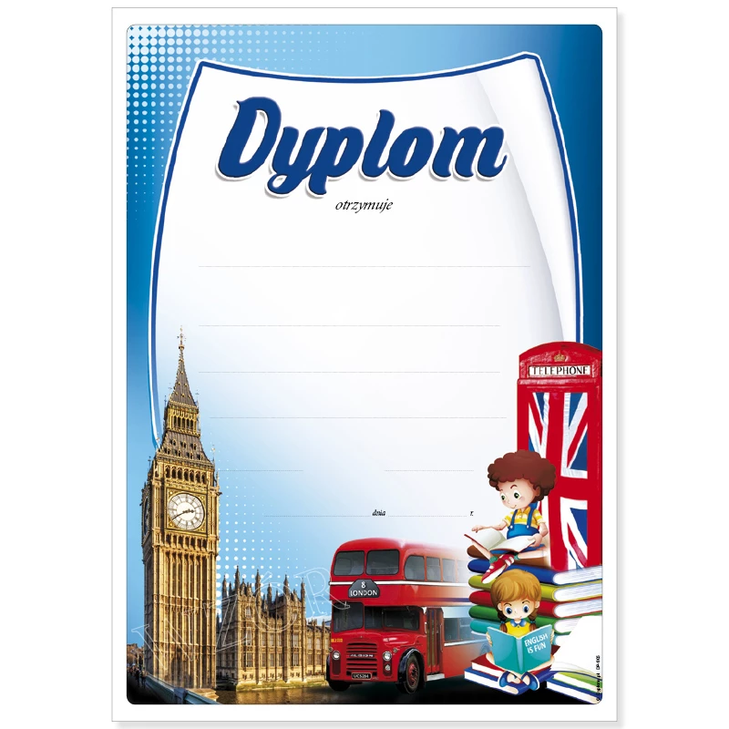 Dyplom językowy wydrukowany na sztywnym, śnieżnobiałym kartoniku. Wyróżnia go trwały nadruk oraz żywa kolorystyka.