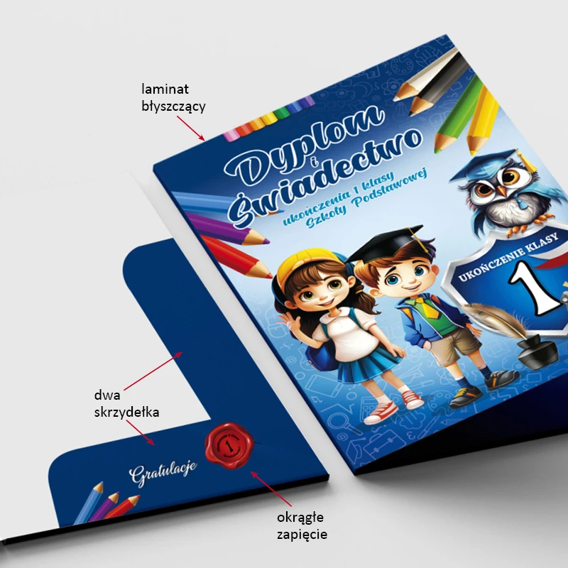 W zestawie otrzymasz dwa wyjątkowe produkty: dyplom ukończenia klasy 1 oraz teczkę. Dyplom wydrukowaliśmy na śnieżnobiałym kartoniku. Ma bajeczną kolorystykę i jest łatwy do wypełnienia. Teczka zabezpieczona jest błyszczącym laminatem. Posiada boczne skrzydełka, chroniące dokumenty przed wypadnięciem.