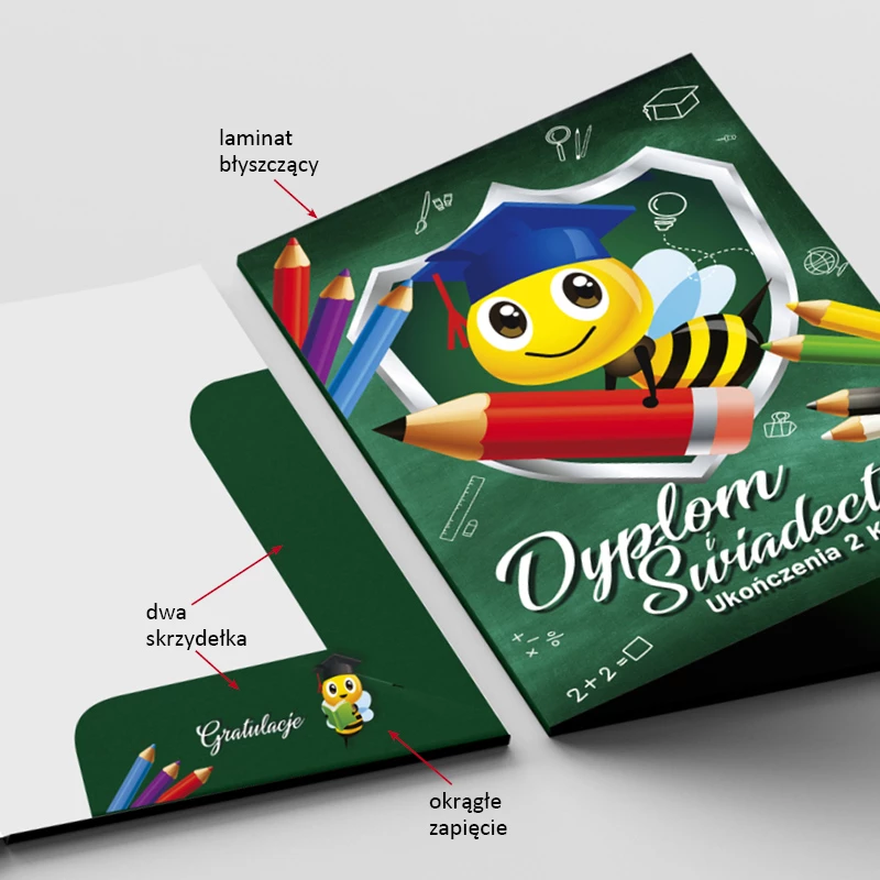 Dyplom ukończenia 2 klasy wydrukowany jest na śnieżnobiałym kartonie. Ma wspaniałą kolorystykę oraz jest łatwy w wypisaniu. W komplecie znajduje się laminowana, błyszcząca teczka ze skrzydełkami, która skutecznie chroni świadectwo i dyplom przed zniszczeniem. Spójny design obu elementów sprawia, że sukcesy ucznia zyskują profesjonalną i trwałą oprawę na lata.