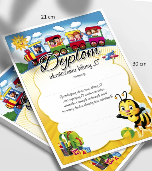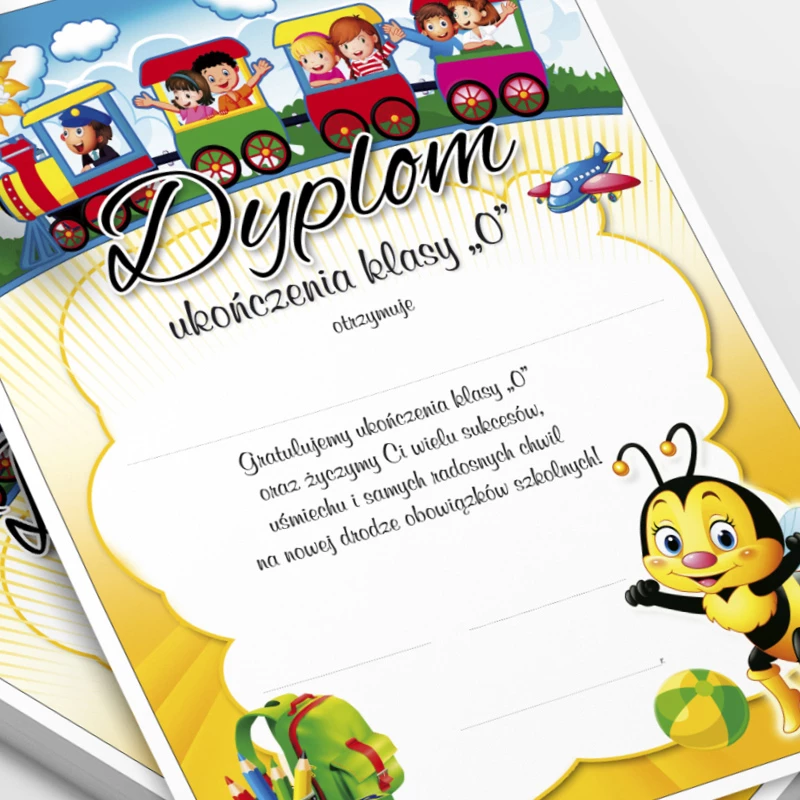 Dyplom Ukończenia Klasy "0" wydrukowany na grubym, śnieżnobiałym kartoniku. Posiada intensywny i trwały nadruk. Jest także prosty w wypełnianiu.