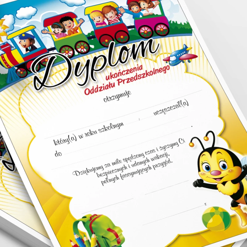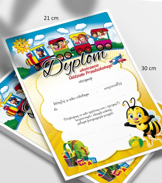 Wyjątkowy dyplom ukończenia oddziału przedszkolnego z radosną pszczółką. Wydrukowany został na sztywnym, śnieżnobiałym kartoniku. Nadruk jest trwały i intensywny, dzięki czemu kolory pozostają żywe przez długi czas. Dyplom jest prosty w wypełnianiu oraz umożliwia przybijanie pieczątek.