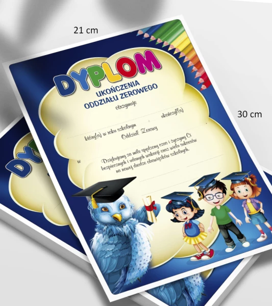 Dyplom Ukończenia Oddziału Zerowego wydrukowany na grubym, śnieżnobiałym kartoniku. Posiada intensywny i trwały nadruk. Jest także prosty w wypełnianiu.
