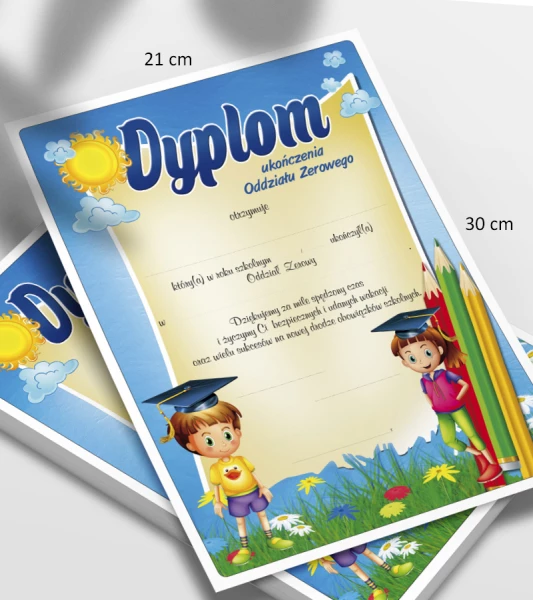 Dyplom Ukończenia Oddziału Zerowego wydrukowany na grubym, śnieżnobiałym kartoniku. Posiada intensywny i trwały nadruk. Jest także prosty w wypełnianiu.
