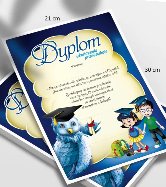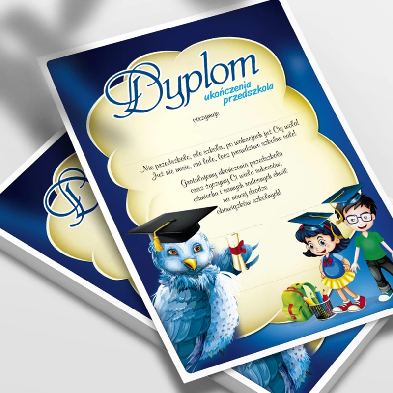 Dyplom wydrukowany na sztywnym, śnieżnobiałym kartoniku. Swój magiczny wygląd zawdzięcza specjalnym tonerom, dzięki którym kolory są aż o 30% żywsze niż w podobnych produktach na rynku. Nadruk zachowuje intensywność barw przez wiele lat, dzięki czemu dyplom staje się trwałą pamiątką pierwszych sukcesów i uroczystości pożegnania przedszkolaka.