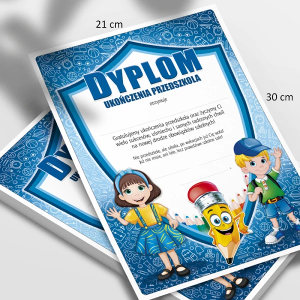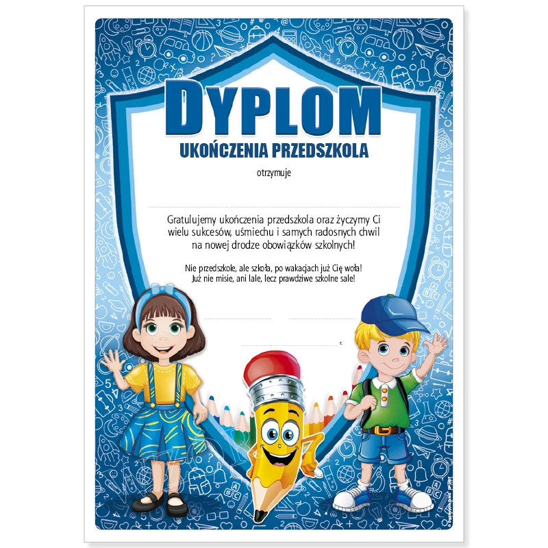 Dyplom przeznaczony na zakończenie przedszkola. Wydrukowany został na sztywnym, śnieżnobiałym kartoniku. Posiada trwały i intensywny nadruk, który przez lata zachowuje piękno kolorów.