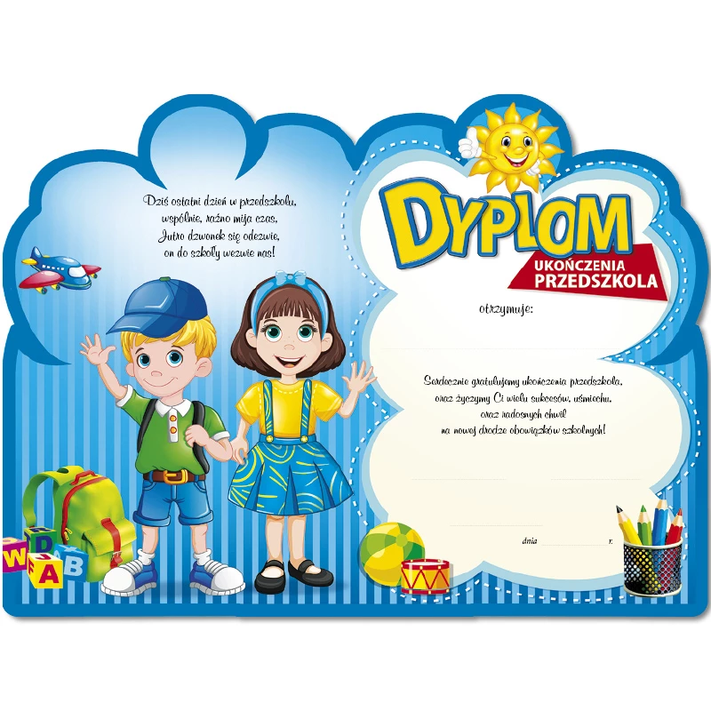 Zwróć uwagę na przejrzystą treść – dyplom jest intuicyjny i łatwy do wypisania, co oszczędza czas przy większej liczbie dzieci.