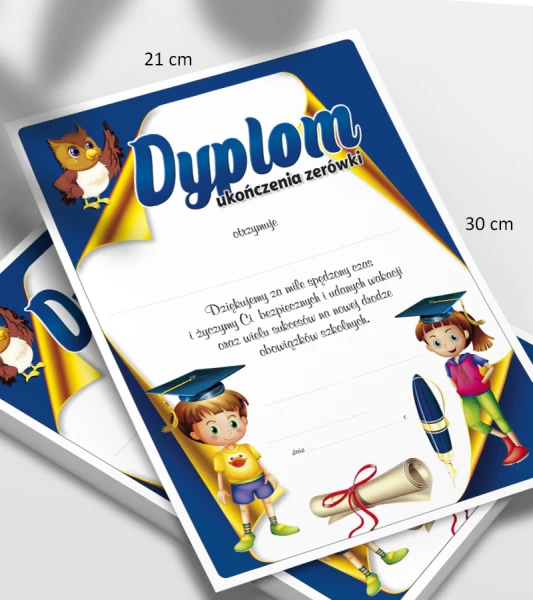 Dyplom Ukończenia Zerówki wydrukowany na grubym, śnieżnobiałym kartoniku. Posiada intensywny i trwały nadruk. Jest także prosty w wypełnianiu.