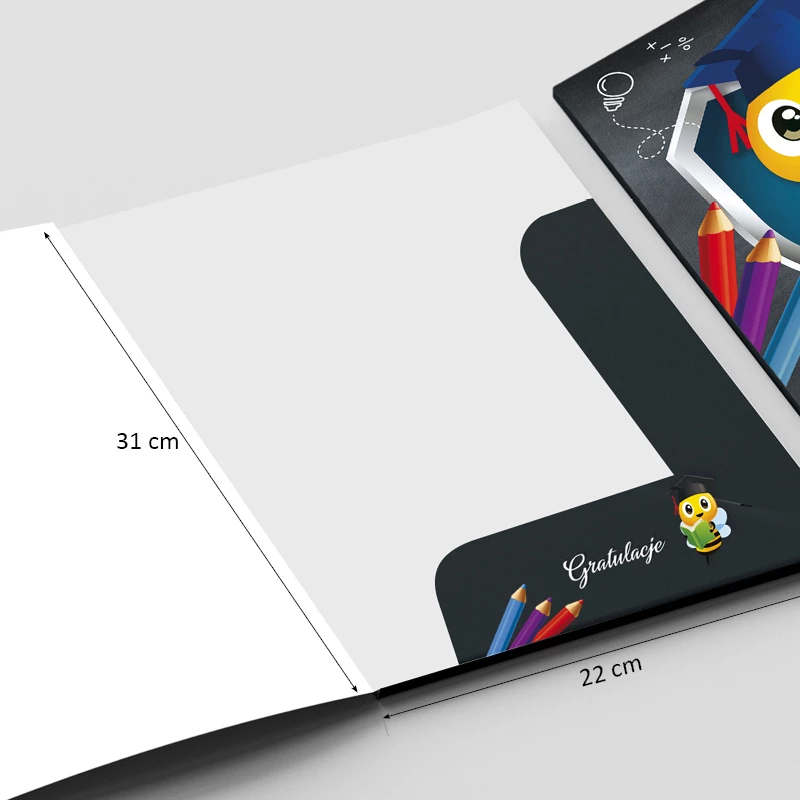 - Bezpieczne przechowywanie dokumentów – boczne skrzydełka pewnie utrzymują dyplom i świadectwo.