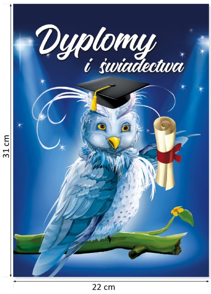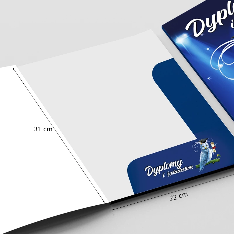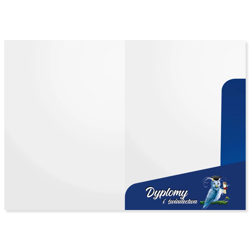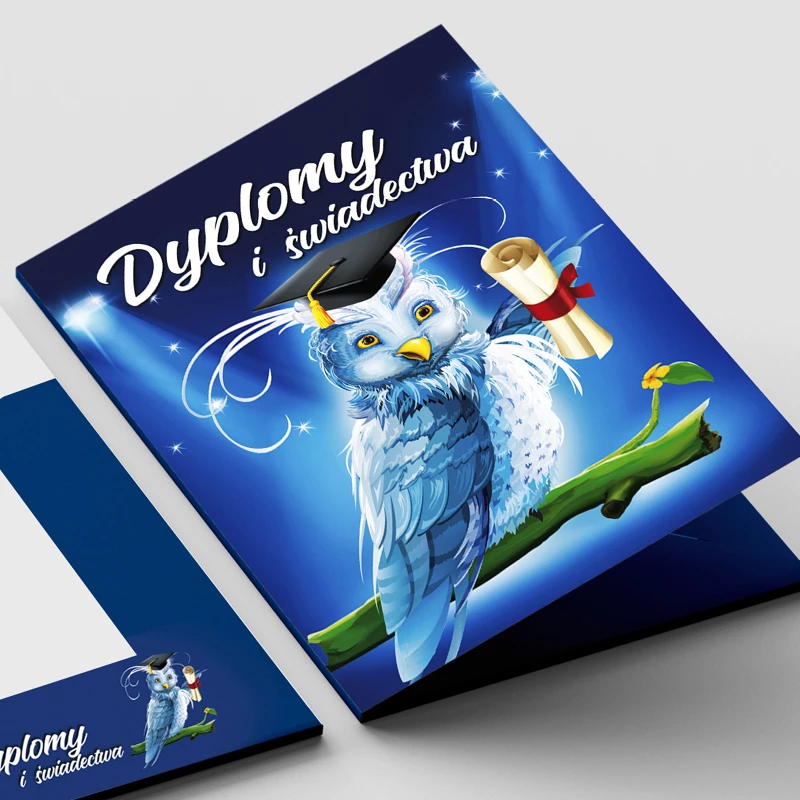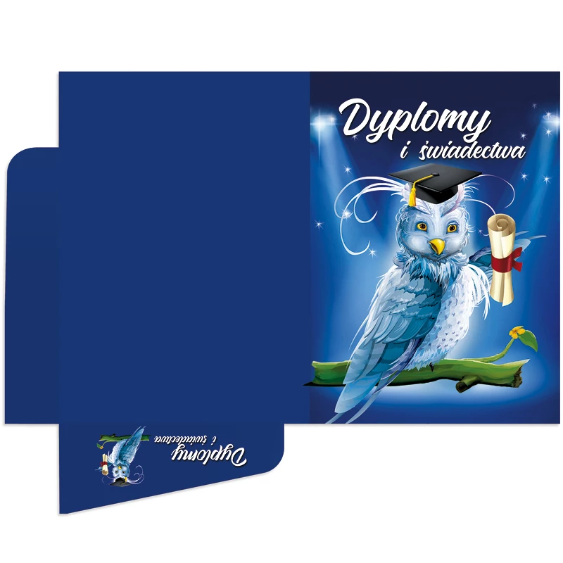 Wykonana z wysokiej jakości kartonu. Wyróżnia się głęboką kolorystyką oraz wyrazistym nadrukiem zabezpieczonym błyszczącym laminatem. Unikalny system zapinania skrzydełek zwiększa trwałość, a uniwersalna grafika pasuje do większości dyplomów z naszej oferty.